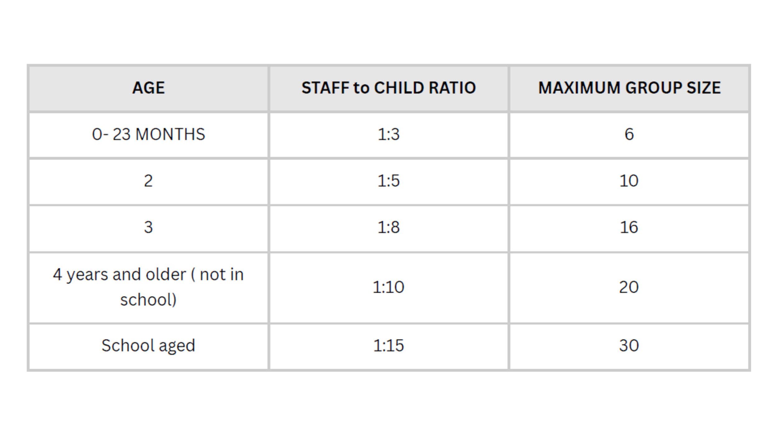 We will be following the New Brunswick regulations for staff-to-children ratio as follows: